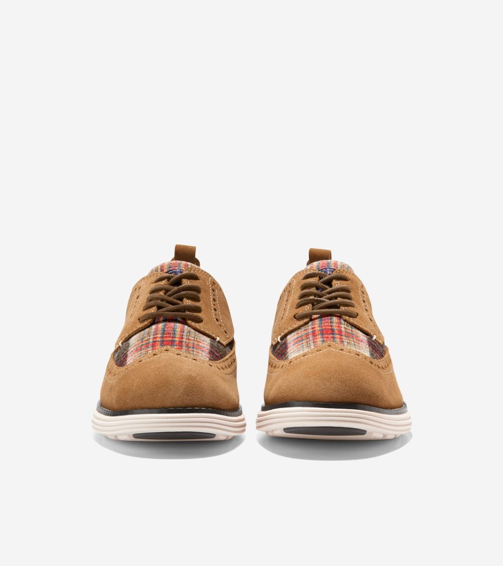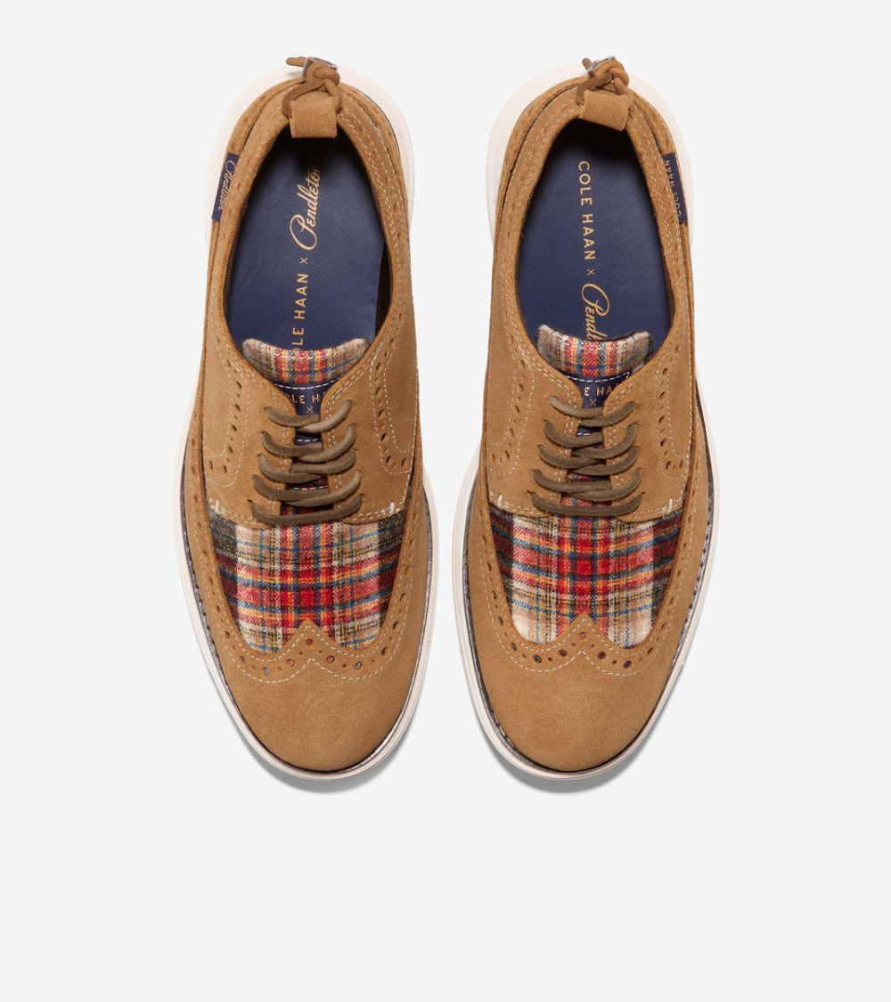 Meet the Cole Haan x Pendleton OriginalGrand Longwing Oxford. This special-edition style features the iconic Longwing Oxford silhouette crafted in oiled suede with signature Pendleton plaid incorporated into the elegant brogue. Plus this style's lightweight construction and cushioned GRANDFOAM footbed deliver ultimate walkability.