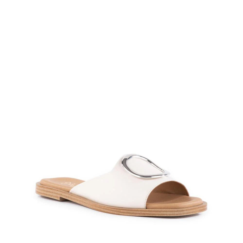 This flat, open-toe slide embodies understated luxury with its minimalist design and premium craftsmanship. Crafted from super-soft leather, its single-band upper features a gold or silver ring ornamentation. Cushioned insoles and a rubber outsole ensure all-day comfort and stability, making it the perfect companion for your everyday adventures.