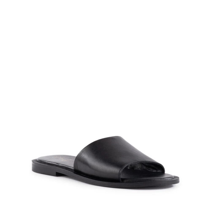 Classic and easy, these chic open toe slide sandals are a warm weather staple. With a luxurious dark leather finish and cushioned insoles, they will instantly elevate any look.