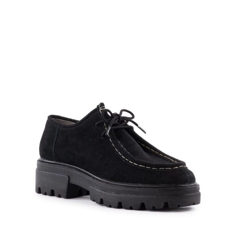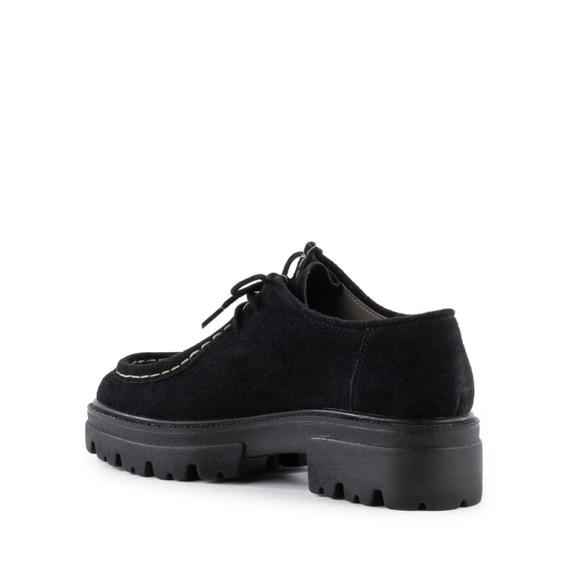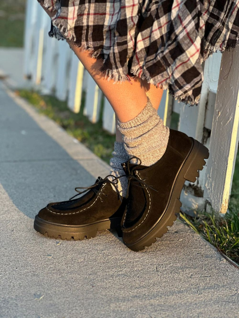 Get ready to be charmed by these on-trend platform Oxfords - a true cult classic! These stylish wallabee moccasins feature a suede round toe, beautifully accentuated with contrasting stitching. The square heels and chunky lug soles complete the casual look, adding a touch of uniqueness and flair.