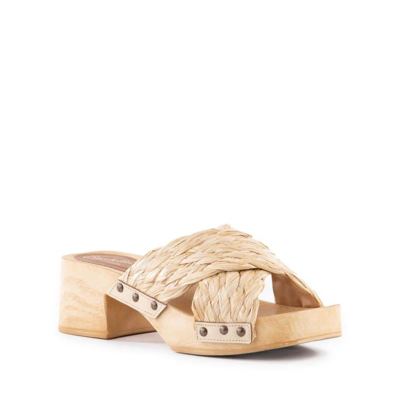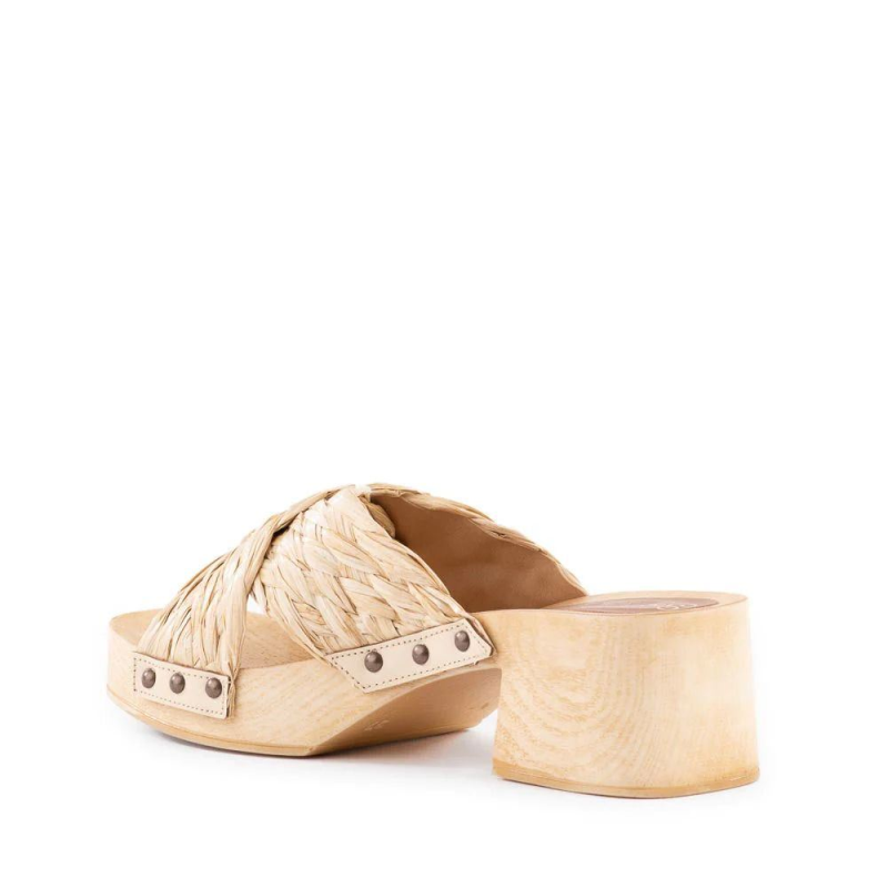 Made in Italy, these open toe heeled slide sandals feature a crisscrossing leather upper and burnished stud detailing. The lightweight platform is treated with a natural wood-like finish, giving a fresh approach to the classic clog.