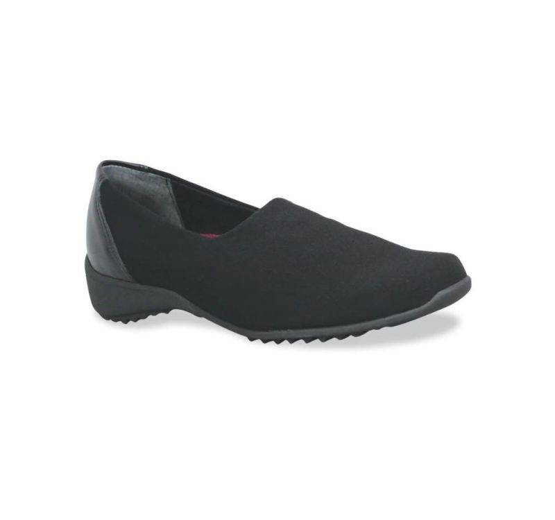 The Traveler is made with black stretch fabric, treated for water resistance, with a black leather heel cover. A perfect walking shoe that is great when traveling. When comfort is demanded and tailored is the look, this is the shoe for you. The low, wedge, TPU outsole is flexible and lightweight. Includes a steel shank for lateral stability and all-day comfort.