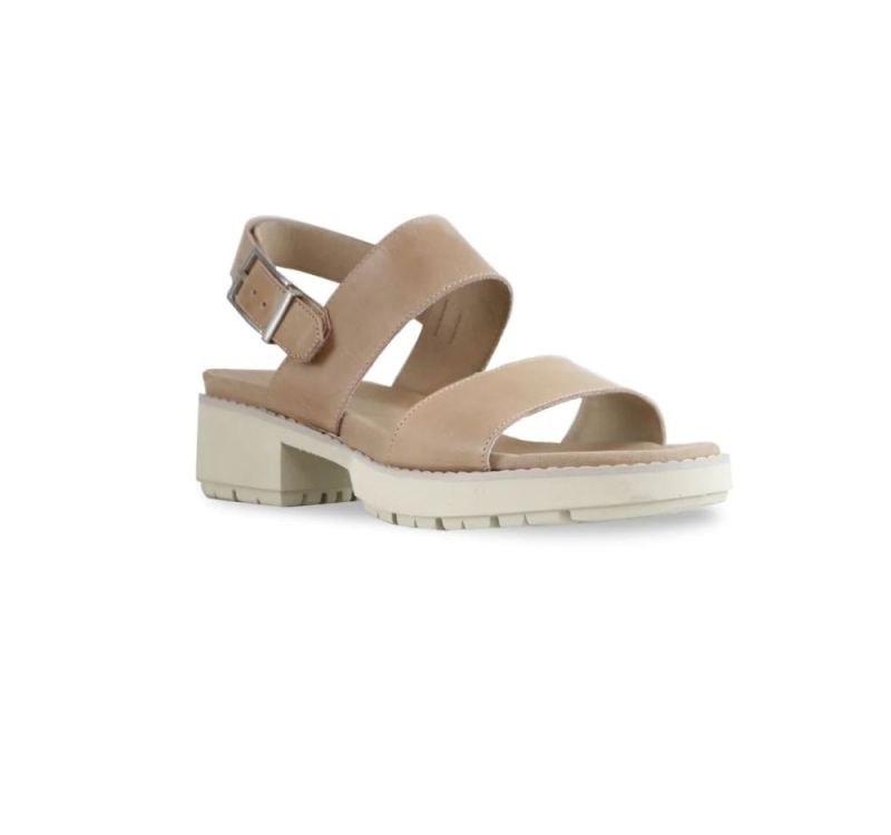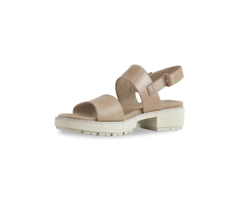 Introducing a new ultra-comfortable and ultra-lightweight EVA lug outsole design for spring 2023. The winter white, latte color calf leather upper of the two-strap Teagan sandal with a hook & loop back strap and decorative buckle will pair wonderfully with summer styles any year.