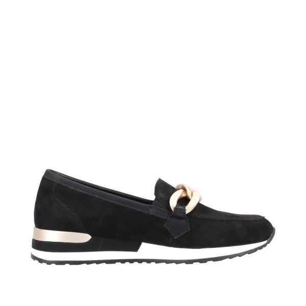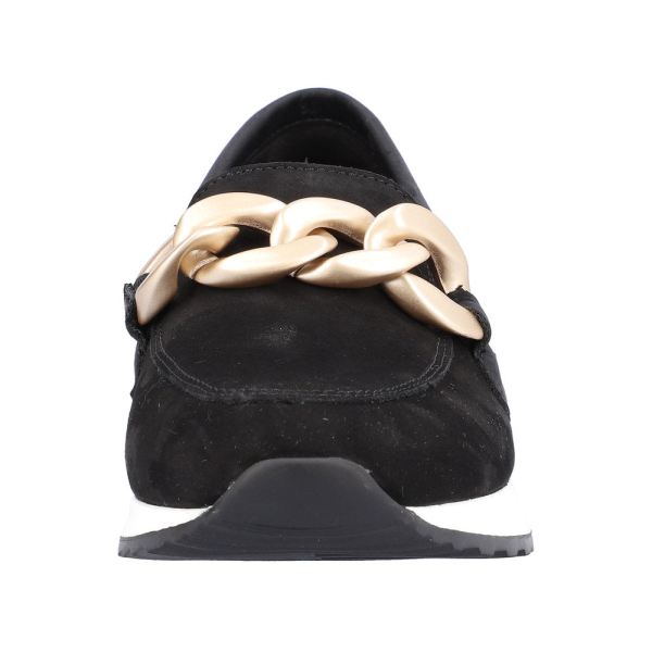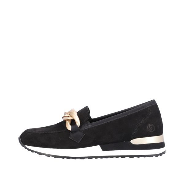 Modern style can be comfortable! These loafers made of suede leather by remonte are the perfect everyday companion in night black. The shoe has no fastener and can therefore be put on in no time at all. The stylish golden chain is a real eye-catcher. An exchangeable footbed and the cushioning and flexible sole are great goodies on top. The model is also optionally available in oversizes. Thanks to the light microvelour lining, ideal comfort is guaranteed. You can't get more style than this!