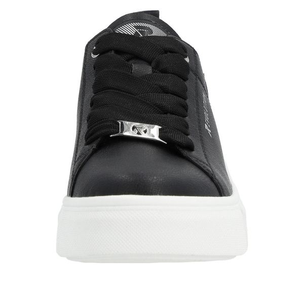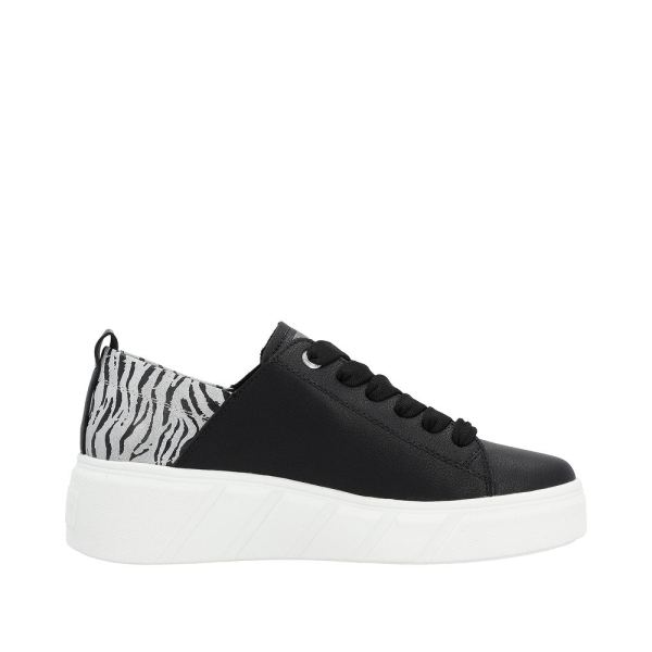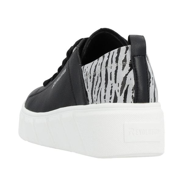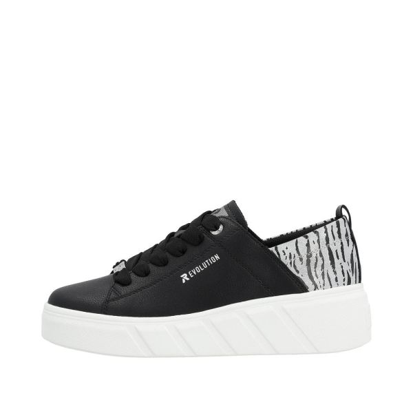 Coolness times three - more style, more comfort, more function! These black sneakers by Rieker EVOLUTION for ladieses made of smooth leather are the perfect shoes for every day! Furthermore, the wide lacing ensures that the shoe fits well at all times. With the shock-absorbing and very light sole, your feet will enjoy best comfort at every step. The padded and removable insole is the practical comfort feature par excellence. The shoe is lined with lightweight microvelour that is breathable. More is not possible!