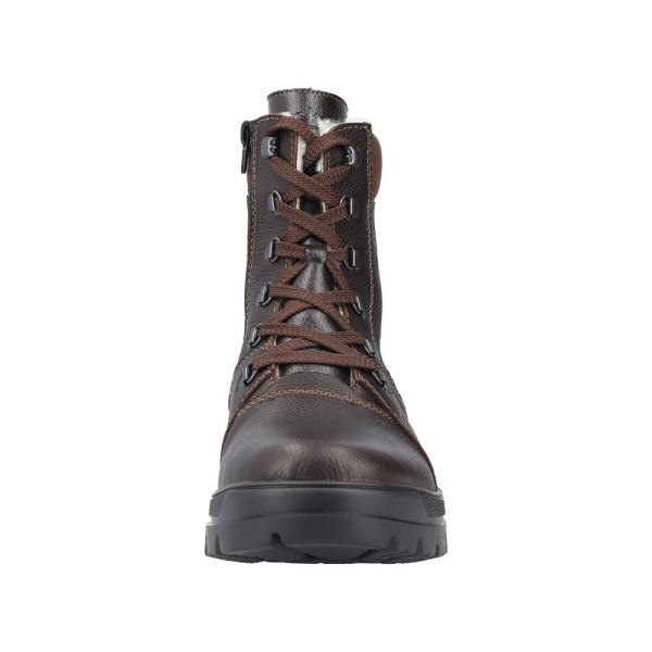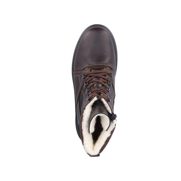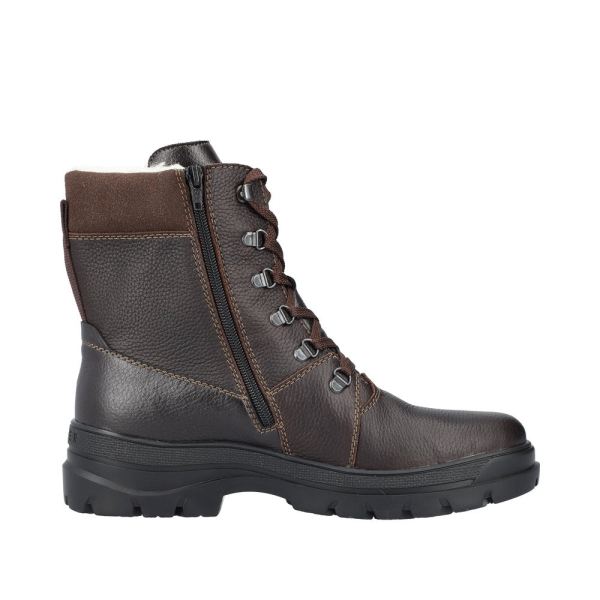 More space for your feet! These black brown lace-up boots made of smooth leather by Rieker combine cool design with best comfort and high functionality. The clever combination of lacing and zipper gives optimal support and makes it easy to put on and take off the shoe. The silver eyelets efficiently freshen up the design. With the flexible and ultra-light sole, your feet will enjoy best comfort at every step. The lace-up boots are super comfortable thanks to the removable insole. A feel-good factor on top is the comfort width G 1/2, which offers more space in the shoe. The Flip-grip sole offers extra security on slippery surfaces, while the water-repellent RiekerTEX membrane provides protection from wetness and wind. Cozy and very warm virgin wool keeps the feet warm all day long. Functional and fashionable to brave the cold weather!