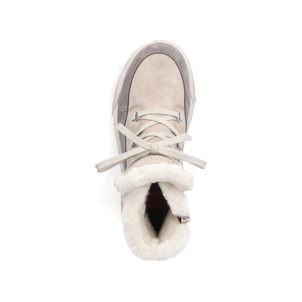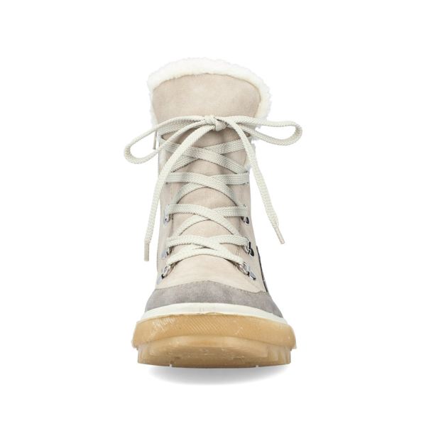 Put an end to cold feet! These light beige lace-up boots by Rieker have been intricately crafted. The clever combination of lacing and zipper gives good support and allows for fast putting on and taking off. The silver colored eyelets efficiently freshen up the design. The shock-absorbing and light sole is a feel-good factor on top and the extra soft cover sole provides additional comfort. The model is cut in comfort width G. A cozy warm lining and the tried-and-tested RiekerTEX technology make these lace-up boots the perfect companions - no matter when, no matter where! Nothing stands in the way of long walks!