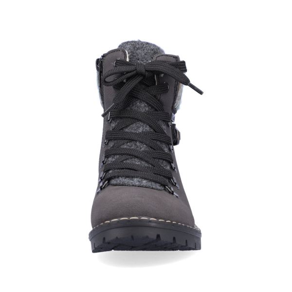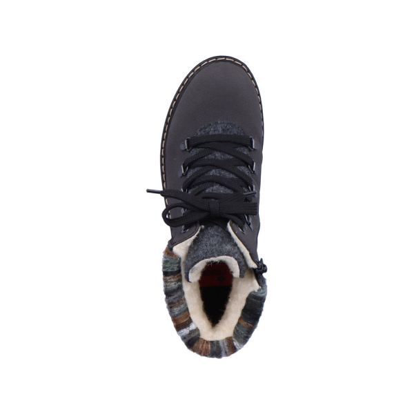 On the fashion radar! These dark grey lace-up boots are a comfortable companion. The lacing complements the zipper and thus guarantees optimal support and perfect fit. The metallic decorative elements on the side harmoniously round off the look of the shoe. The robust profile sole makes every step a safe affair, and the extra soft removable cover sole is another plus. The cozy and very warm virgin wool lining is guaranteed to keep feet warm all day long and thanks to the RiekerTEX membrane they stay dry too! Let's rock the cold days!